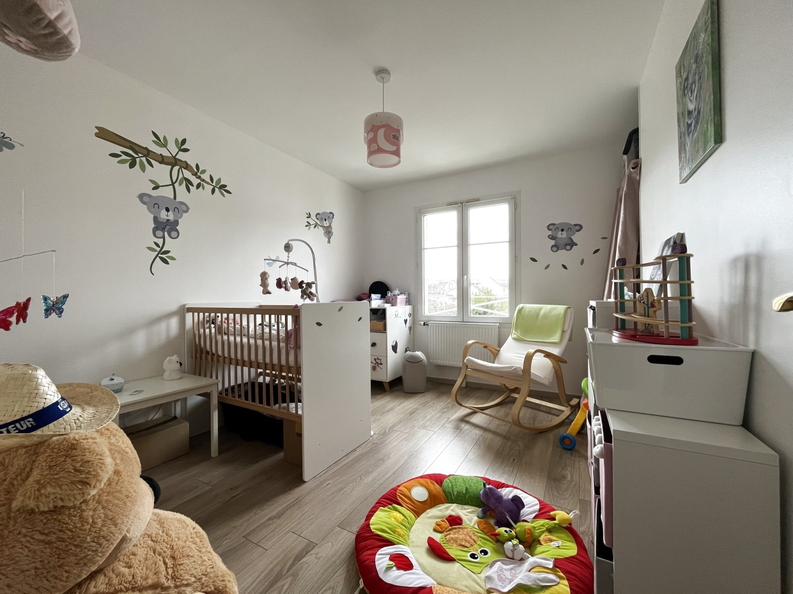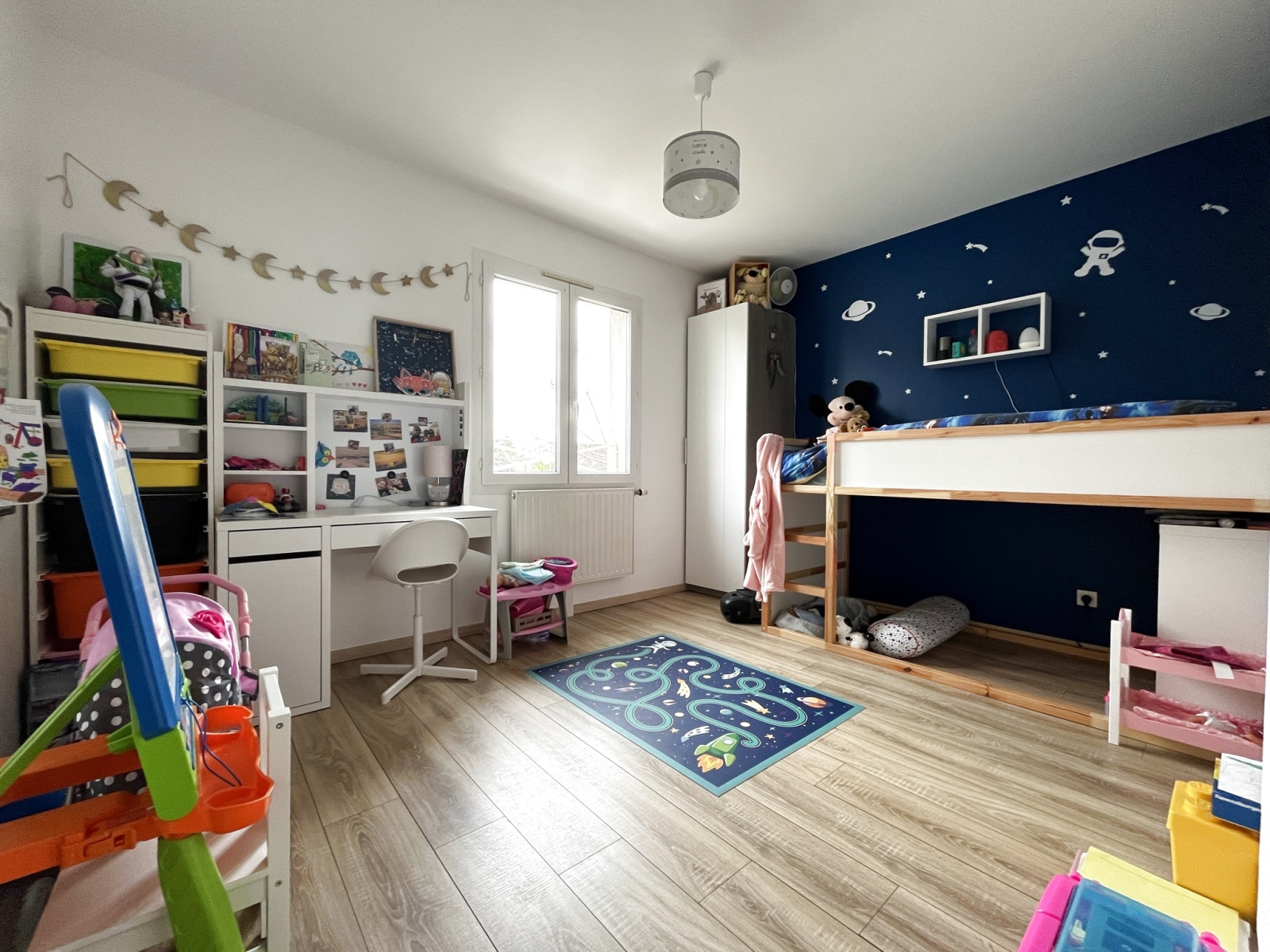 A l'étage, le palier distribue 3 chambres (14.3 m², 12.2 m² et 12.5m²) toutes avec placards intégrés, une salle de bain, un WC indépendant et une lingerie.