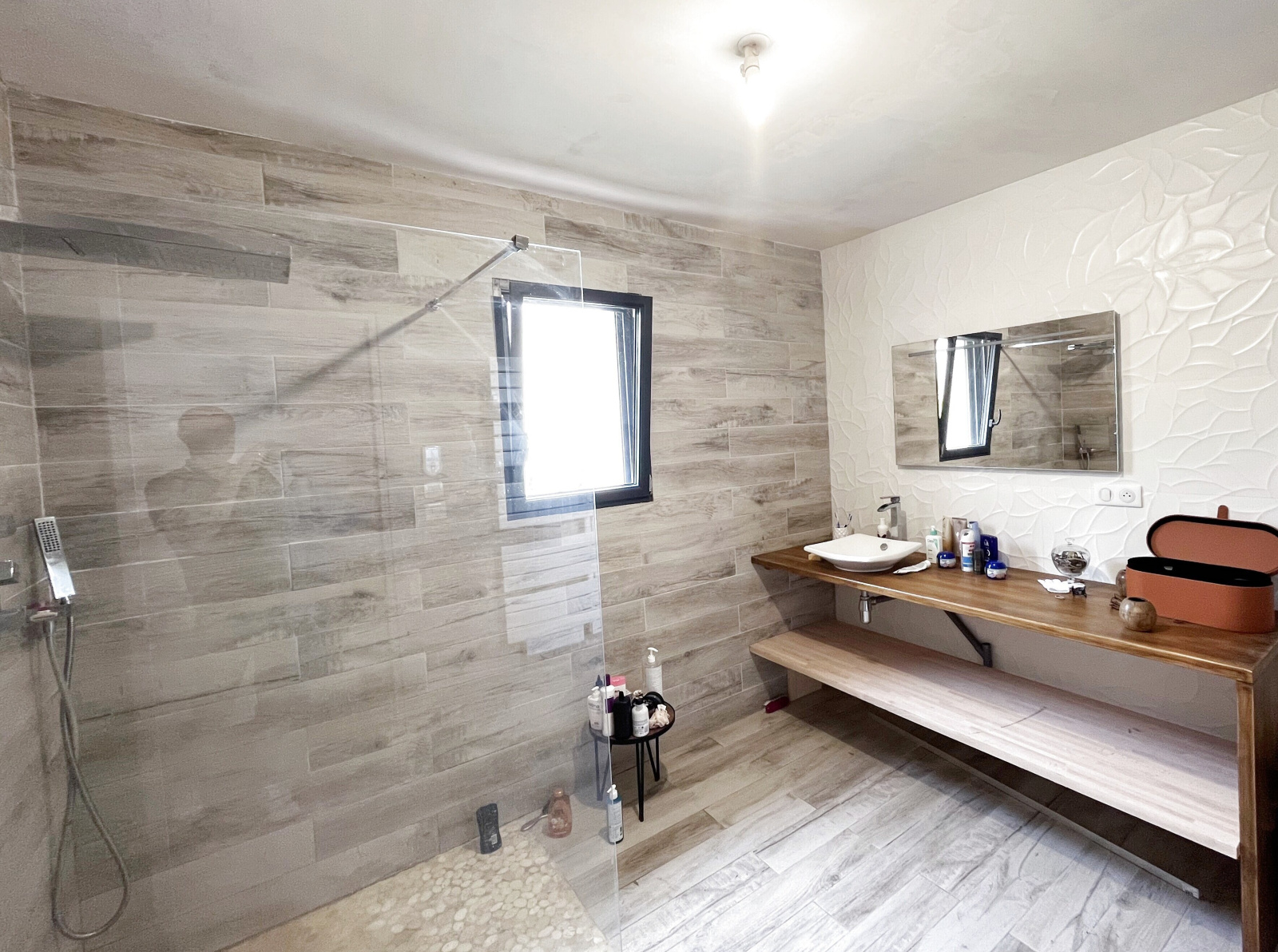 Poursuivez votre découverte en empruntant une porte à galandage double qui vous mènera vers l'espace nuit. Là, vous trouverez une chambre parentale de 13,8 m² avec sa salle de bain privative, ainsi que deux autres chambres de 12,7 m² et 16,5 m² respectivement. De plus, une salle d'eau moderne de 7,5 m² avec une douche à l'italienne et des WC indépendants avec fenêtre extérieure complètent cet espace de repos et d'intimité.